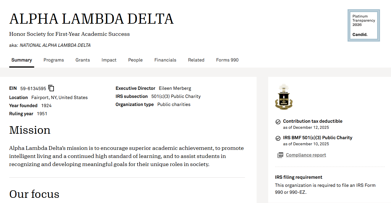 As a 501(c)(3) nonprofit organization, Alpha Lambda Delta achieved the Platinum Seal of Transparency on Candid (previously GuideStar). Candid gathers and disseminates information about every single IRS-registered non-profit organization. Candid serves to provide as much information as possible on each non-profit's mission, legitimacy, impact, reputation, finances, programs, transparency, governance, and more. The Platinum Seal is the highest level and represents an organization’s transparency with contact information, mission, governance, financial information, and impact questions (goals, strategies, capabilities, indicators, and progress). View the Alpha Lambda Delta profile on Candid.